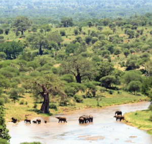 If you choose Tarangire, you’ll begin your game drive across a breathtaking expanse of golden savannah that surrounds the Tarangire River. This vital water source flows yearround, attracting a wealth of wildlife, especially during the dry season. The river is lined with majestic acacia and Baobab trees, often frequented by large herds of elephants and other herbivores like zebras and antelopes.